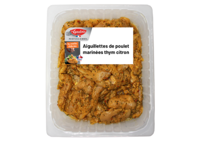 - Le Gaulois Professionnel vous propose ses aiguillettes de poulet marinées thym-citron, produits tendances, les aiguillettes de poulet offrent de nombreuses possibilités de préparation. Facilement portionnables, elles vous permettent de répondre facilement aux contraintes du GEMRCN, et sont donc particulièrement adaptées pour la restauration sociale (La juste portion = moins de déchets dans l'assiette et une maitrise précise de son budget). Marinées Thym citron , une saveur estivale appréciée de tous les convives