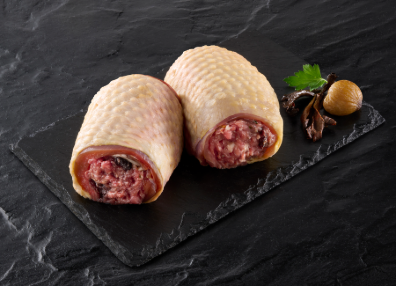 - Cuisse de chapon roulée façon ballotin, garnie d’une délicieuse farce marrons trompette, ce produit sans porc et sans ficelle est idéal pour la restauration