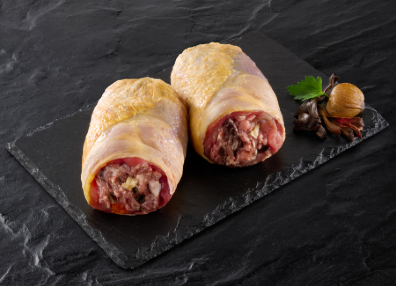 - Cuisse de pintade roulée façon ballotin, garnie d’une délicieuse farce marrons trompettes, ce produit sans ficelle est idéal pour la restauration.