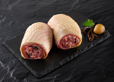 - Cuisse de poulet roulée façon ballotin, garnie d’une délicieuse farce marrons trompettes, ce produit sans ficelle est idéal pour la restauration.