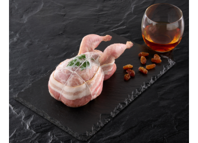 - Faite à la main et garnie d'une savoureuse farce aux raisins et aux Cognac.