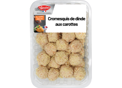 - Les cromesquis de dinde et carotte, une délicieuse garniture de cuisse de dinde cuisinée avec des petits pois et enrobés d’une panure croustillante.