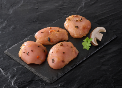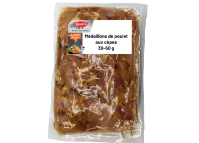 - Des morceaux de cuisse de poulet CALIBRÉS 30-50g marinés aux cèpes prêts à être cuits et à un tarif abordable