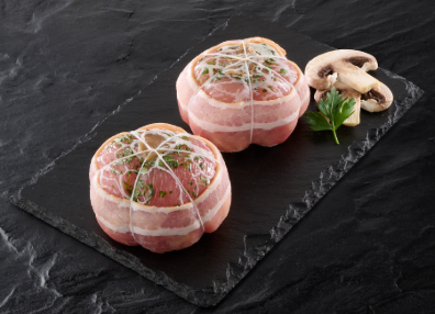 - Faite à la main, formée à partir d'une escalope de dinde, d'une farce aux champignons forestier, entourée d'une tranche de poitrine fumée.