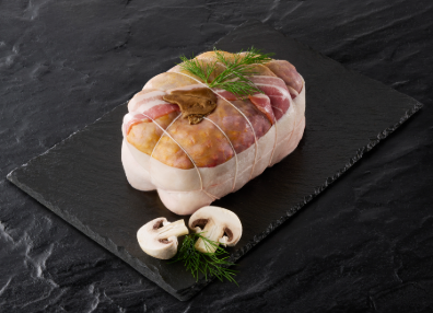 - Fait à la main, formé à partir d'un demi chapon de pintade désossé et d'une farce aux champignons forestiers.
