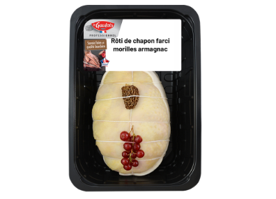 Le Gaulois Professionnel vous propose un généreux rôti de chapon fait à la main, farci aux morilles et à l'Armagnac et décoré de morilles.